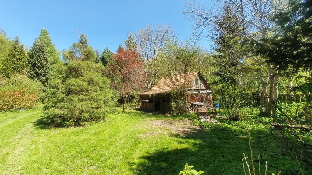 Na działce stoi drewniany budynek obecnie pełniący funkcję